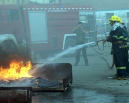 演練現(xiàn)場(chǎng):消防隊(duì)員對(duì)火災(zāi)現(xiàn)場(chǎng)進(jìn)行撲救