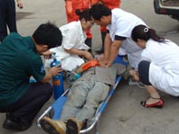 演練現(xiàn)場(chǎng):醫(yī)療救援人員對(duì)中毒人員進(jìn)行搶救