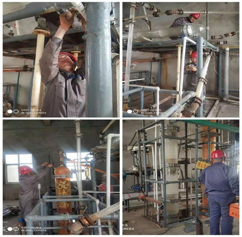 溴素二廠提取冷凝器設(shè)備因使用年限長,冷凝器內(nèi)管有斷裂且沉積物過多堵塞,冷凝效果降低,給溴的蒸餾冷凝及質(zhì)量、產(chǎn)量帶來影響。針對這種狀況,廠班子研究決定對冷凝器進行集中更換。由于疫情影響,物流停運,春節(jié)前在石家莊預(yù)定的設(shè)備無法正常發(fā)貨。為了能夠完成生產(chǎn)任務(wù),溴素二廠職工多次對冷凝器漏水部位采取封堵措施,堅持生產(chǎn)運行。
