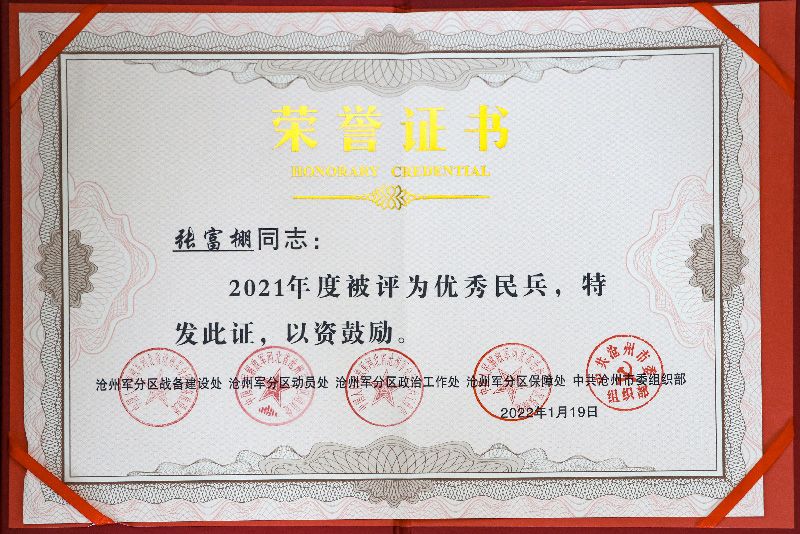 此外,公司武裝部長(zhǎng)張富棚還被滄州軍分區(qū)授予“2021年度優(yōu)秀民兵”稱(chēng)號(hào)。