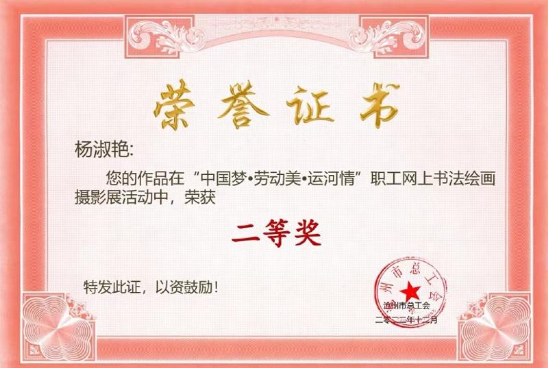 近日,從滄州總工會(huì)傳來(lái)好消息,公司職工楊淑艷攝影作品《搶修》在滄州總工會(huì)舉辦的“中國(guó)夢(mèng)·勞動(dòng)美·運(yùn)河情”職工網(wǎng)上書(shū)法繪畫(huà)攝影展活動(dòng)中獲得二等獎(jiǎng)。