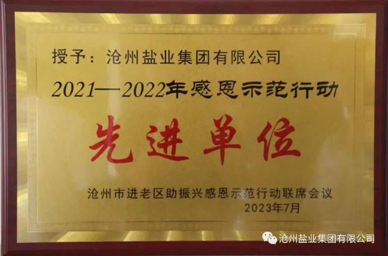 2023年7月,集團公司被滄州市進老區(qū)助振興感恩示范行動聯(lián)席會議授予“2021—2022年感恩示范行動先進單位”榮譽稱號。
