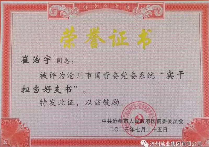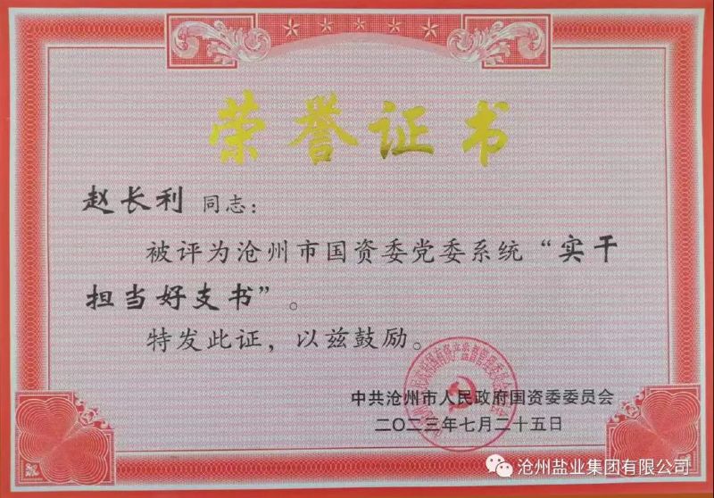 近日,我公司基層黨組織書記趙長利、崔治宇被中共滄州市人民政府國資委委員會授予“實干擔(dān)當(dāng)好支書”稱號,并受到表彰。
