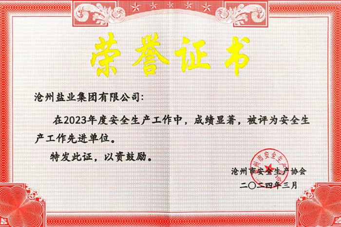 近日,滄州鹽業(yè)集團(tuán)有限公司榮獲滄州市2023年度 “安全生產(chǎn)先進(jìn)單位”榮譽(yù)稱號(hào),這是公司連續(xù)第11年獲得該項(xiàng)榮譽(yù)。