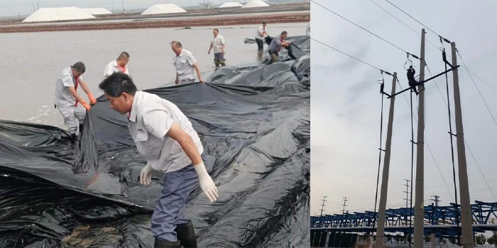 受強(qiáng)降雨及大風(fēng)影響,長蘆黃驊鹽業(yè)有限公司、青鋒鹽業(yè)有限公司塑膜大范圍被毀,在建項(xiàng)目及建筑公司各施工項(xiàng)目房屋、圍擋、大門、牌子等均有損壞,大風(fēng)還造成公司電力線路受損,公司大面積停電,其他單位庫房、車間房頂、門窗及生產(chǎn)生活設(shè)施也有不同程度損壞。