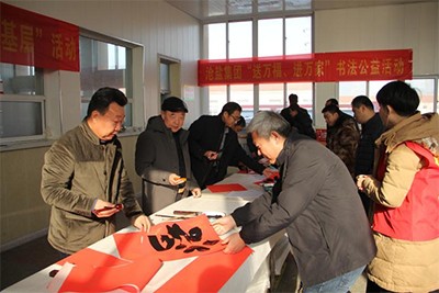 活動(dòng)現(xiàn)場(chǎng),長(zhǎng)桌排開,翰墨飄香,6名滄鹽集團(tuán)退休和在職的書法愛好者們凝神聚氣,揮毫潑墨。隨著筆鋒的轉(zhuǎn)動(dòng),一副副字體蒼勁有力、瀟灑飄逸的新春對(duì)聯(lián)躍然紙上,別樣的大“!弊謳(lái)滿滿的幸福感,讓職工群眾提前感受到了濃濃的年味。