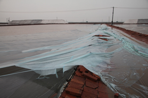 此次災(zāi)害性天氣,造成公司生產(chǎn)場區(qū)大面積結(jié)晶塑膜被毀,部分苫封鹽膜被掀。盡管各生產(chǎn)單元組織人員頂風(fēng)冒雨對刮開撕裂的結(jié)晶池塑膜進(jìn)行了緊急搶修,但由于塑膜受損面積大,仍造成部分結(jié)晶池鹵水嚴(yán)重稀釋,池存鹽受到一定程度的損失,給即將到來的汛前制鹵工作帶來困難,對塑苫池雨季曬鹽造成嚴(yán)重威脅。據(jù)統(tǒng)計(jì),因颶風(fēng)撕裂損壞塑膜5763公畝,徹底報(bào)廢塑膜1140公畝,損壞滑道10160米,浮板1901米,宿舍、機(jī)房頂瓦被掀5500塊,長度約1200米的鹽碼苫封塑膜被徹底損毀。