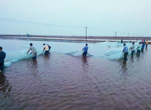 面對形勢異常嚴(yán)峻的雨情,公司保原鹽、保塑苫、保灘田的搶險戰(zhàn)役打響了,從7月17日的141.2毫米暴雨開始,防汛副總指揮李蜻海就防汛工作進行了安排:生產(chǎn)部負(fù)責(zé)好全公司防汛工作的統(tǒng)一調(diào)度工作,制鹵場要想盡一切辦法確保主排淡系統(tǒng)的疏通,并要求各制鹽場的防汛指揮機構(gòu)組織全部啟動,全體一線干部職工都要隨時待命,嚴(yán)陣以待,嚴(yán)防死守,做好搶險自救工作。與此同時,防汛副總指揮李蜻海帶領(lǐng)生產(chǎn)部、制鹵場有關(guān)人員對主排淡系統(tǒng)進行了詳細(xì)巡查,并積極協(xié)調(diào)相關(guān)部門對影響排淡的17處堵卡地段進行了徹底的加寬疏通清理。隨著7月21日60.2毫米降水的到來, 29日、30日,8月2日、3日連續(xù)四場計270毫米的強降水席卷了整個生產(chǎn)場區(qū),生產(chǎn)基礎(chǔ)遭受到空前的劫難,隨著化工企業(yè)、海通物流、周邊村莊荒水以及縣辦及周邊鹽場排淡水的大量涌入公司主排淡溝道,使排淡溝道水位迅猛上漲,外圍水位已經(jīng)高于灘內(nèi)水位,灘內(nèi)淡水無法外排,情況萬分緊急,公司防汛形勢處于一級警戒狀態(tài)。