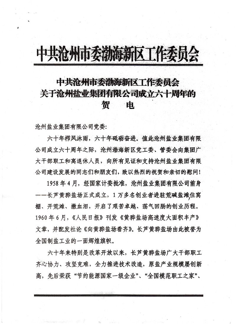 滄州渤海新區(qū)黨工委、管委會發(fā)來賀電,對公司成立六十周年表示祝賀,對公司過往取得的輝煌成就予以充分肯定,并寄望滄鹽集團(tuán)繼續(xù)發(fā)揚(yáng)滄鹽精神,深化改革,加快推進(jìn)轉(zhuǎn)型升級,助力滄州渤海新區(qū)高質(zhì)量發(fā)展。
